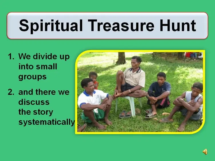 We divide up into small groups of 4-6 people. The facilitator asks a set of questions specific to the story. Each participant searches for the spiritual treasures and shares them with the group. The facilitator is not teaching but he can contribute and summarize the findings.